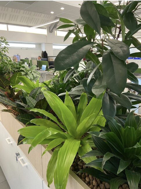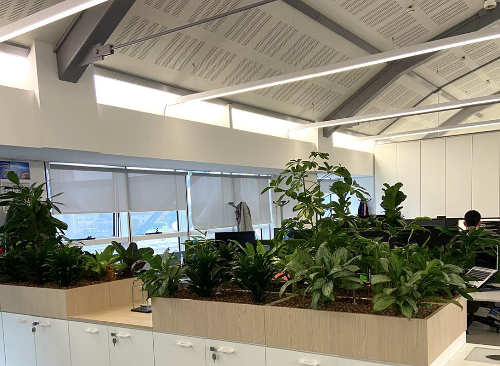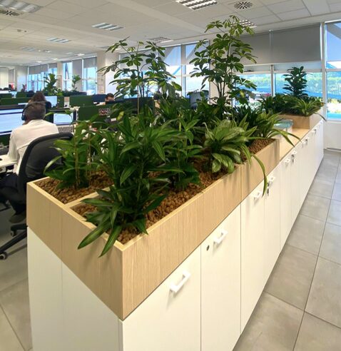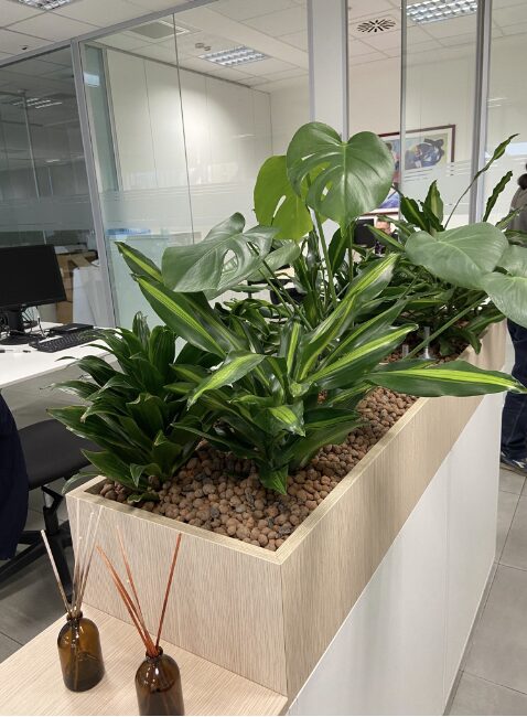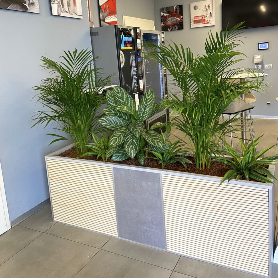 Rendono gli spazi più gradevoli dal punto di vista estetico, aumentando così la sensazione di benessere e l’attrattiva complessiva degli ambienti. Infine definiscono i percorsi e le diverse aree di lavoro attraverso i volumi vegetali in coerenza con il concept estetico della sede aziendale.